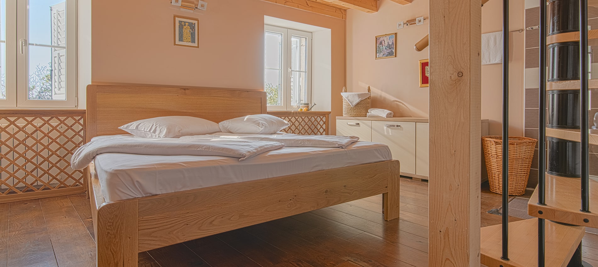 Auf der einen Seite erwartet Sie die Uferpromenade – ideal für den Morgenkaffee oder einen Spaziergang bei Sonnenuntergang. Auf der anderen Seite, versteckt in den alten Gassen, liegt die berühmte Euphrasius-Basilika – ein UNESCO-Juwel, nur eine Gehminute entfernt.