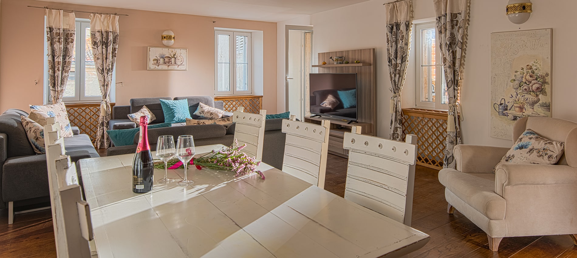 Das Apartment bietet 100 m² stilvoll eingerichteten Raum: zwei gemütliche Schlafzimmer, zwei moderne Badezimmer, eine voll ausgestattete Küche und ein lichtdurchflutetes Wohnzimmer. Alles, was Sie brauchen – Klimaanlage, WLAN, Waschmaschine, Sat-TV, frische Handtücher und erholsamer Schlaf – ist bereits für Sie vorbereitet.